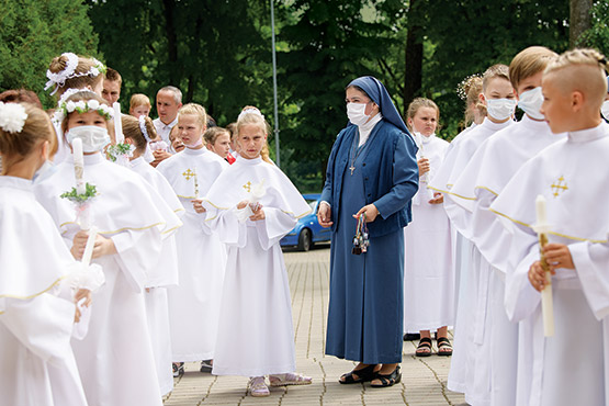 Sovietmetį per kaimą eina moteris kaip niekur nieko. Be jokių ženklų ar garsų iš trobų, sodybų išeina vaikai ir seka paskui ją. Miškelyje jie randa savo vietą – ratu sudėtus rąstus, stačią kryžių ar prie medžio prikabintą kryželį. Slapta vienuolė pamoko vaikus giesmelių, kartu meldžiasi, atpasakoja Šventąjį Raštą, parodo paveikslėlių. Po to visi ramiai išsiskirsto ir grįžta namo. Tais priespaudos laikais pagrindinė vaikams tikėjimą perduodanti katechetė dažnai būdavo močiutė.