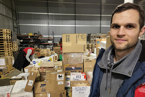 Patikrintas ir sužymėtas dėžes ant palečių nešė savanoriaujantis šeštus metus Carite Justinas. Į 5-ąją paramos Ukrainai akciją jis įsitraukė norėdamas prisidėti prie gerumo darbų. „Jau pačią pirmą paramos rinkimo dieną Megoje buvau. Labai daug žmonių nešė daiktų, maisto produktų. Akcija domėjosi ir prisidėti kvietė vietos žiniasklaida. Mano nuotrauką išpublikavo, tad ir mokyklai buvo proga pasidžiaugti“, – dalijosi Kauno maisto pramonės ir prekybos mokymo centro mokinys.